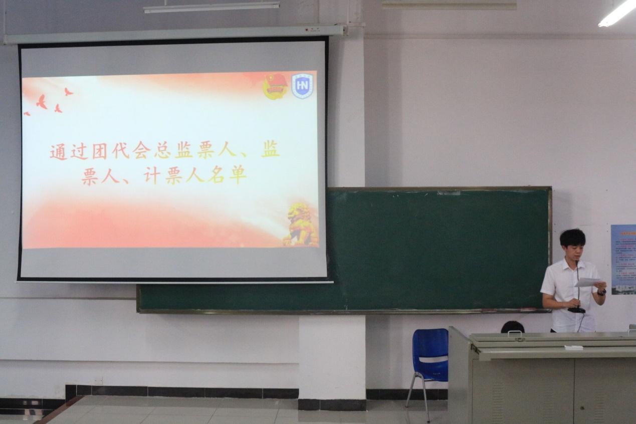 大会第四项,刘士铭同学宣读团代会总监票人、监票人、计票人名单,名单包括总监票人王文超,监票人马俊潇、孙凡舒,计票人王宁、杨璧佩、姚楠楠、张春雷、赵鑫隆。