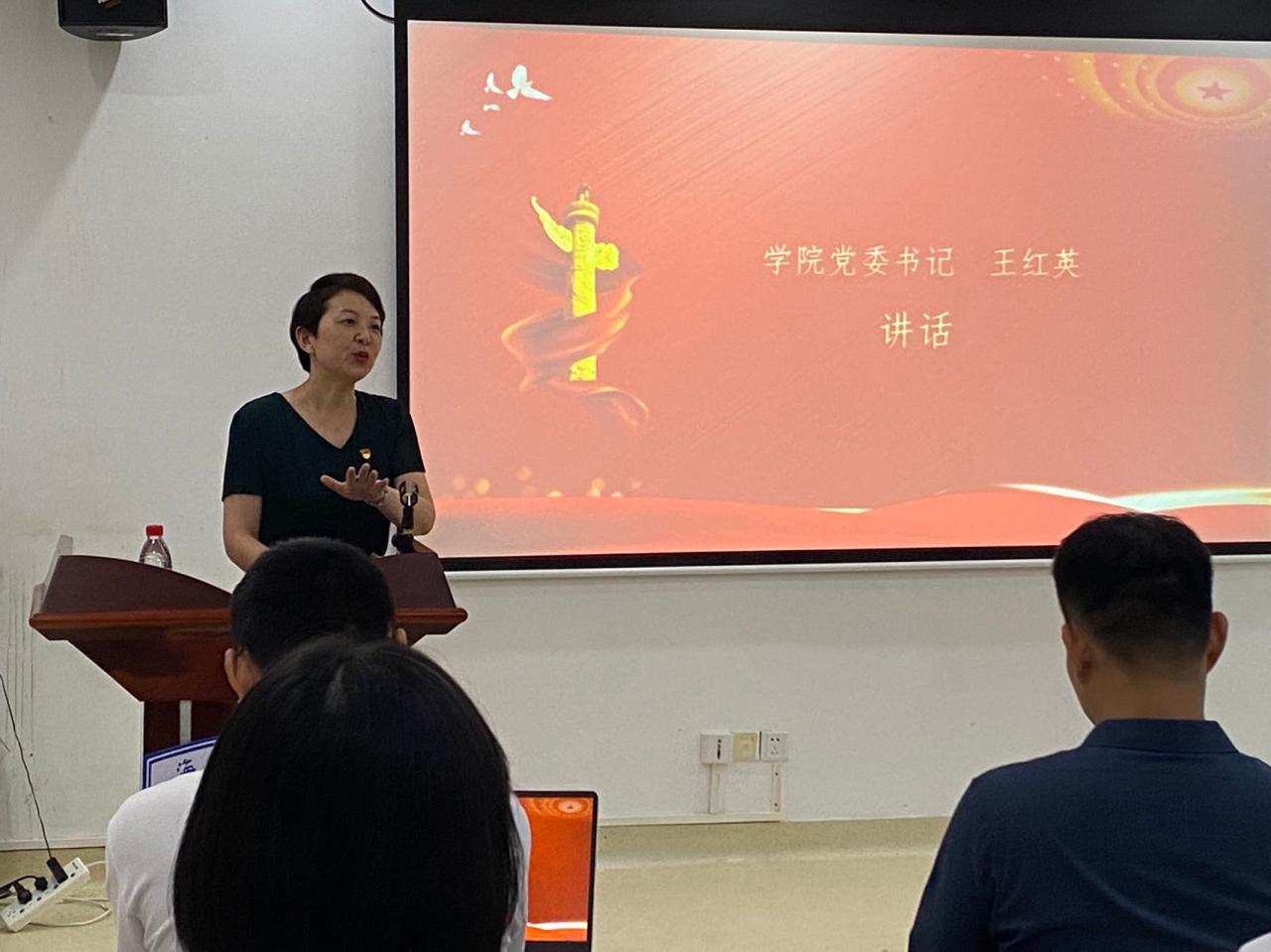 会议第三项,由学院党委副书记王红英发表讲话。王书记从政治素养、党员要求、学生榜样三个方面对学员提出期望,鼓励同学们坚定理想信念,追求思想进步,在学校期间树立共产主义思想,加强政治修养,端正入党动机,做好同学们的榜样。