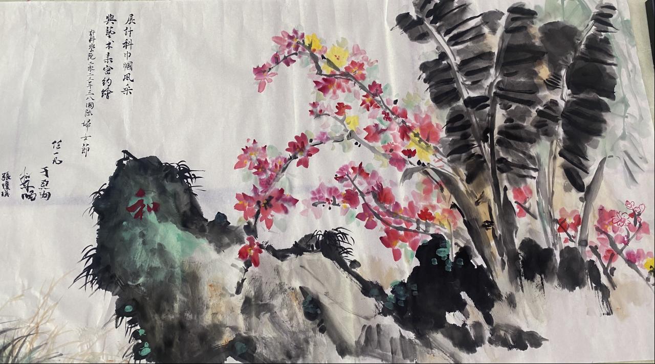 学院工会邀请了美术与设计学院的郭博文老师,指导女老师们的国画绘画基础,并带领大家共同绘制了一幅海大美景。别看我们理工科的女老师们平时都只是和代码、数据打交道,拿起画笔来也依旧风采奕奕。大家专注地跟着郭老师学习如何用墨调彩、如何中锋执笔勾画线条轮廓、如何侧锋运笔表现虚实浓淡,然后又通过临摹郭老师的作品练习花草画法,最后,在郭老师的带领下,大家你点一抹红,她描一叶青,香凝三角梅花蕊,翠落大叶芭蕉身,苔痕映石绿,燕草如碧丝......任一凡老师还在石上写下一个漂亮的“和”字,一幅海大校园小景顿时跃然纸上。