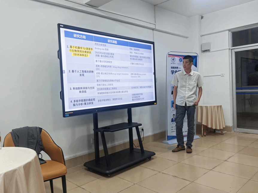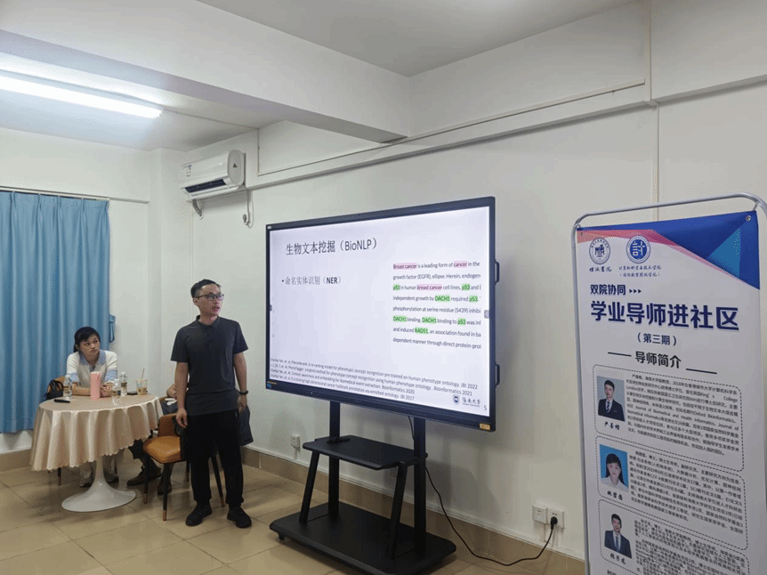 严善楷老师介绍了自己课题组的研究方向,如生物文本等。生动清晰的讲解极大的激发了同学们对生物信息方面的兴趣。他以自己目前开展的疾病辅助诊断等项目为例,告诫同学们要结合自身学习进展,去合理区分研究重点。