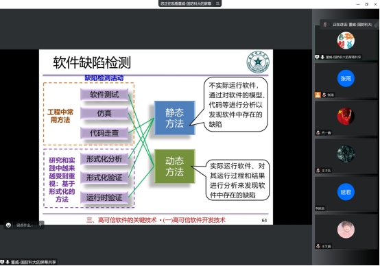 董云卫教授主要讲授了模型驱动开发的协同设计与分析技术,主要包括模型驱动架构的原理和方法、MDA的技术标准和发展趋势、软件架构的定义与内涵等内容。董威教授主要讲授了可信软件技术,主要包括高可信软件的基本概念、关键技术、未来的挑战与相关工作等内容。两位教授的教学广而细致,通俗易懂,不仅对软件工程前沿的研究方向和技术进行了详细的阐述,还列举了相关的应用案例,理论联系实际,突出重点,为同学们起了很好的引导作用,使同学们对这一学科有了更深的认识。
