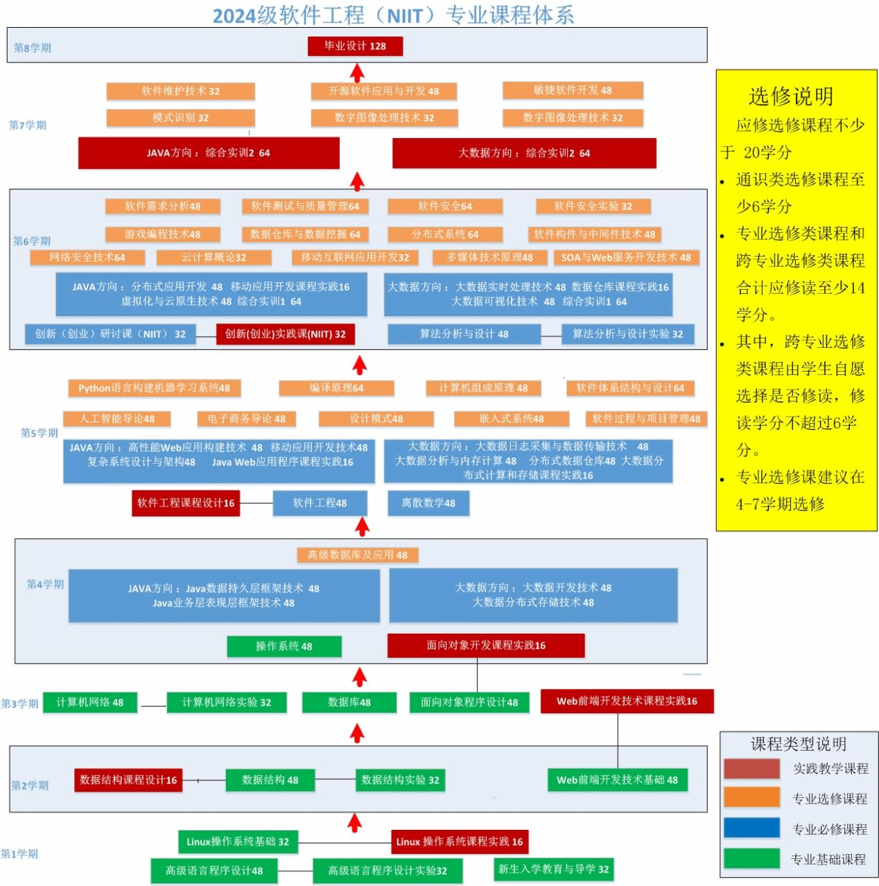 数据结构、离散数学、算法设计与分析、操作系统、软件工程、数据库系统、计算机网络以及Java和大数据两个方向的NIIT嵌入式实践开发前沿课程等。