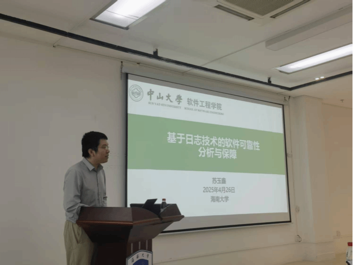 随后,中山大学软件工程学院副院长苏玉鑫副教授带来了题为《基于日志技术的软件可靠性分析与保障》的学术报告。苏教授长期致力于系统软件可靠性与运行时优化领域的研究,在软件工程与云计算系统运维方面具有丰富的科研经验。报告中,苏教授围绕现代复杂软件系统在云计算环境下的故障诊断问题,介绍了如何利用日志分析技术,结合传统方法与大模型工具,从故障检测、诊断到预防各个环节进行智能化处理,提升软件系统的可靠性与稳定性。他还分享了科研实践中的典型案例及应用成效,为与会师生提供了系统软件可靠性保障的宝贵经验。
