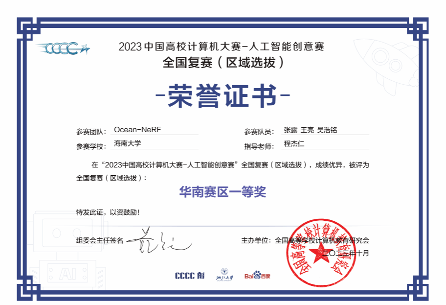 近日,2023年(第六届)“中国高校计算机大赛-人工智能创意赛”复赛圆满结束,决赛名单揭晓。十大信誉网赌学生团队作品“基于神经辐射场三维重建技术的三维数字海洋旅游纪念品生成平台 ”荣获了华南赛区一等奖,成功晋级决赛。该作品由程杰仁教授指导,张露、王亮、吴浩铭三位同学共同完成。