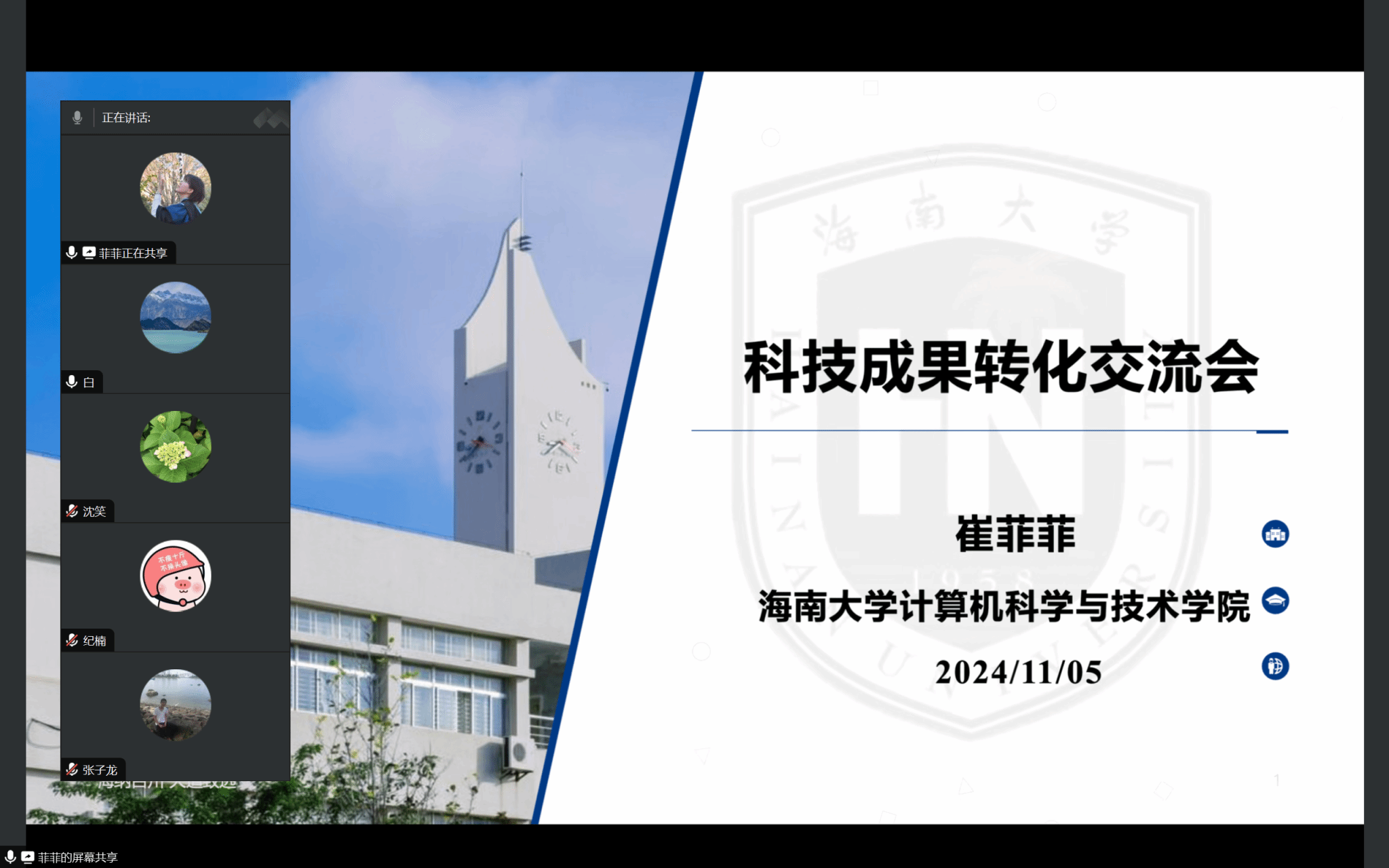 11月5日,澳门十大信誉网赌大全举行科技成果转化交流会,会议邀请到正在国外访学的崔菲菲老师进行了线上精彩分享。