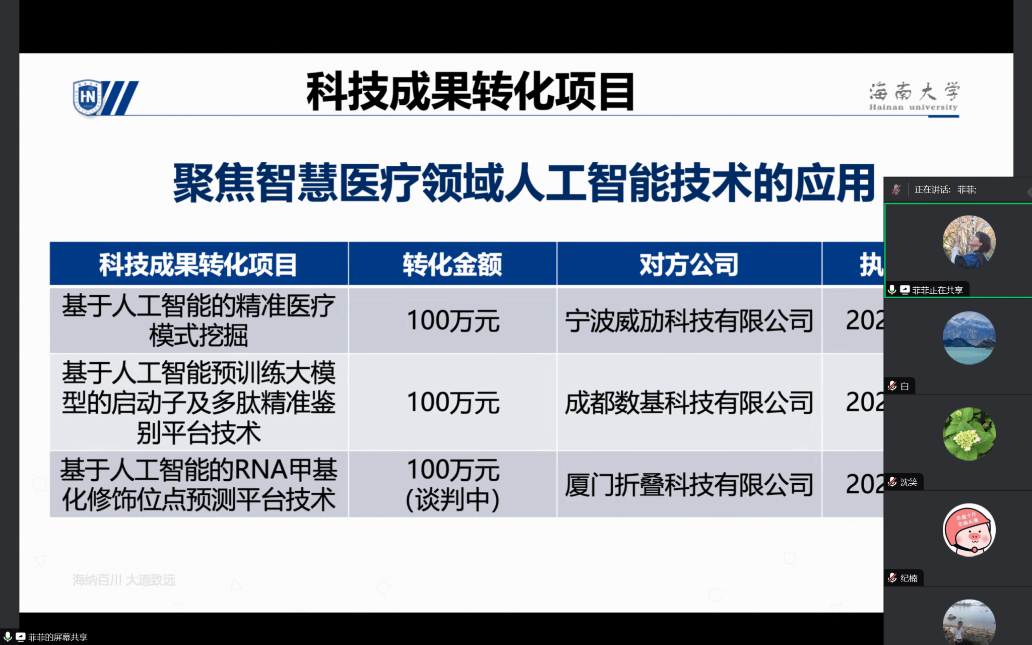 接下来,由学院崔菲菲老师分享个人成果转化的经验。首先,崔老师介绍了个人的国家发明专利情况,并介绍如何通过已有的国家发明专利进行成果转化。据悉,崔老师在2024年已经成功完成两个成果转化,合同金额共计200万元。其次,崔老师介绍了自己目前的科研方向,以及如何将科研和企业的需求进行结合,从而有利于后续产学研合作或国家专利成果的转化。随后,崔老师介绍了学校关于成果转化相关的审批流程。
